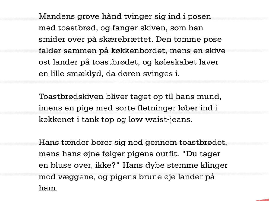 Hans tænder borer sig ned gennem toastbrødet, mens hans øjne følger pigens outfit. "Du tager en bluse over, ikke?" Hans dybe stemme klinger mod væggene, og pigens brune øje lander på ham.